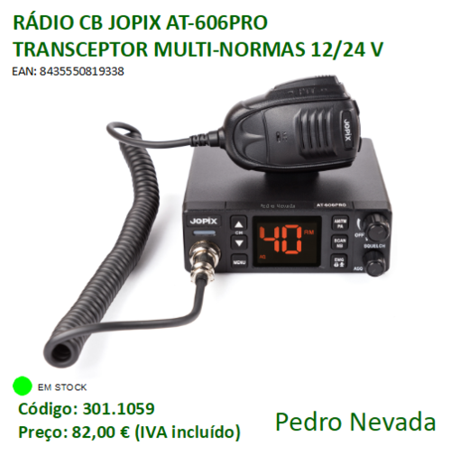 O Jopix AT-606PRO é um rádio FM/AM CB (Citizen Band, Banda do Cidadão) com multi-normas europeias com um grande ecrã LCD, tamanho compacto e facilidade de uso, adequado para uso em qualquer lugar do veículo.